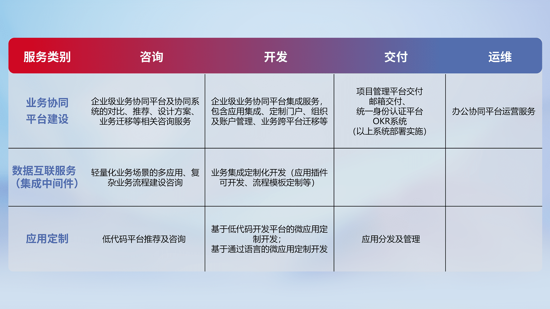 针对钉钉、、、、企微、、、、IDaas等平台级产品提供产品的规划、、、方案、、、、交付、、定制化开发等服务,,,,实现如统一协同办公、、、、智能客户服务、、、混合会议管理、、、智能数据查询、、、、等业务场景,,实现数字化转型。。。